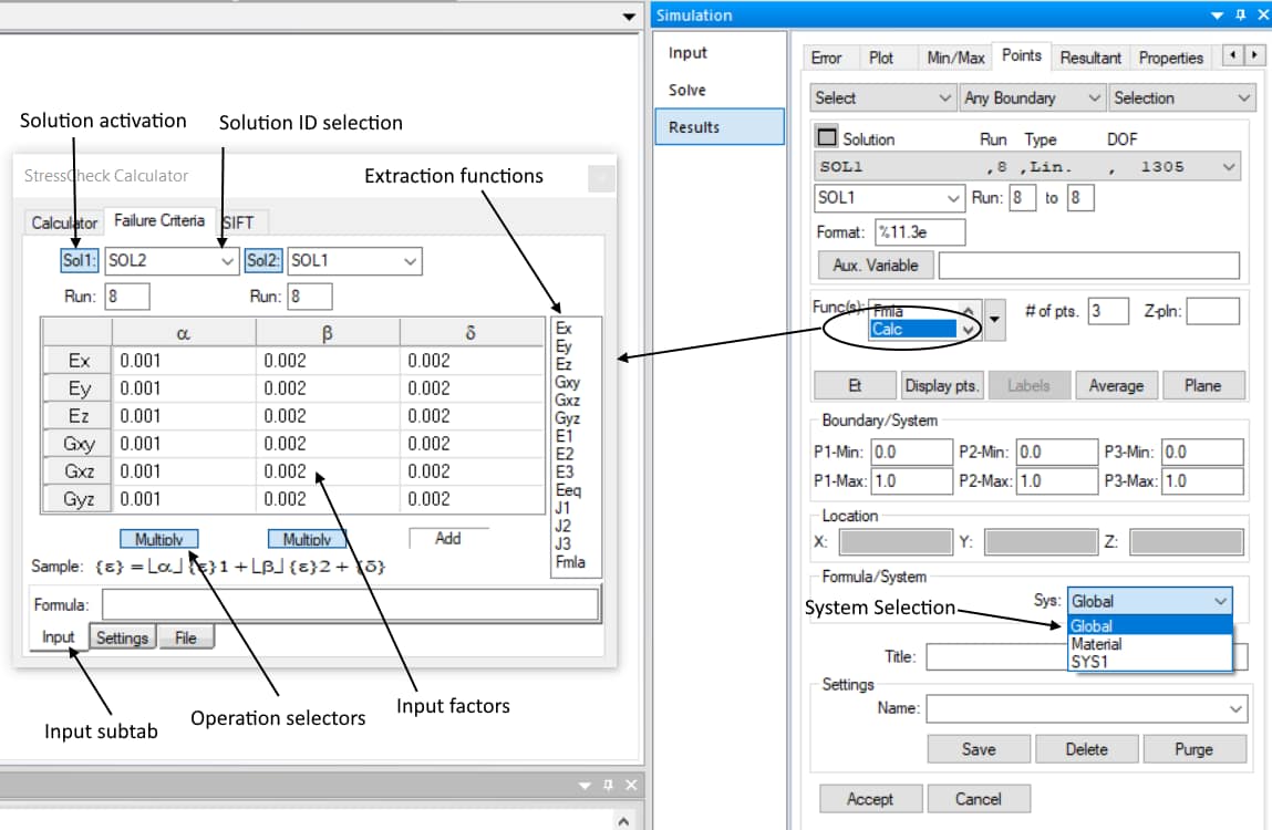 Selection of the solution ID and run number from the set of existing finite element solutions that will be used to compute the combined strain-related quantities. If zero is entered as a run number, then it is possible to get convergence results based on the run settings in the corresponding Results tab (Points or Min/Max).