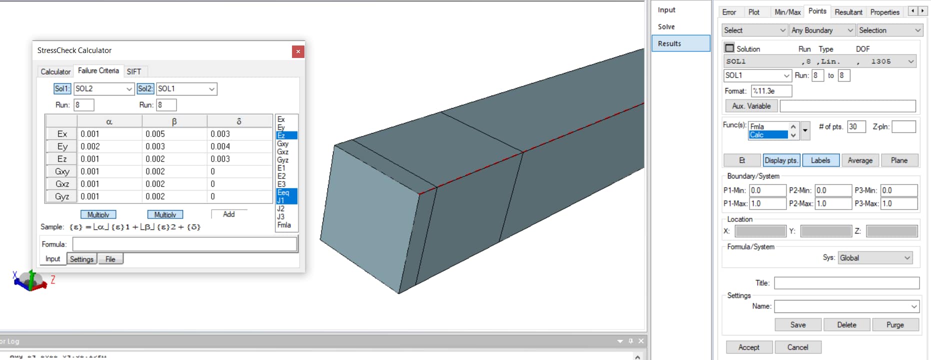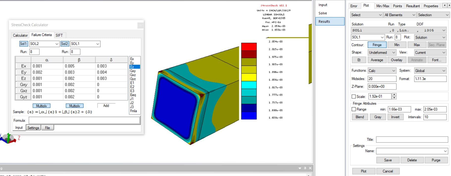 The principal strains and strain invariants are computed from the directional strains obtained from the finite element solution. To properly account for the effects of mechanical and thermal loads, separate finite element solutions are typically required because the constraint conditions for the mechanical loads may be different from those for the thermal loads. Therefore, the procedure implemented in StressCheck allows the user to compute strains by combining any two solutions with the same or different number of degrees of freedom. Additionally, a facility was added for incorporating arbitrary multiplying or additive factors for each solution and a global additive factor.