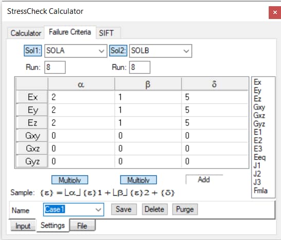 The Settings subtab located at the bottom of the form is used for saving/retrieving the input factors α, β and δ in the current StressCheck session and in the StressCheck project file. The interface is shown in Figure 2.