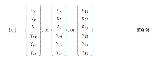 where x, y, z, represent the strain directions in a global or local Cartesian coordinate system; r, θ, z are the strain directions in a cylindrical coordinate system; and 1-2-3 refer to the strain directions in the material coordinate system (applicable to orthotropic and laminate materials). Which one of these strain tensors is computed depends on the coordinate system selection in the Results pane.
