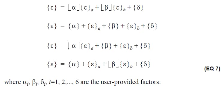 Input fields to enter the factors to be used for each solution in the context of Eq. 7. The factors can be constants or previously defined parameter names. The toggle switch under each column controls whether the factors are multiplied or added to the strains computed from each solution. Add or Multiply applies for α and β factors only; the δ factors are always additive. The sample expression located under the Add/Multiply buttons is adjusted based on the setting of the operation selectors to help the user understand the use of the factors as indicated by Eq. 7.