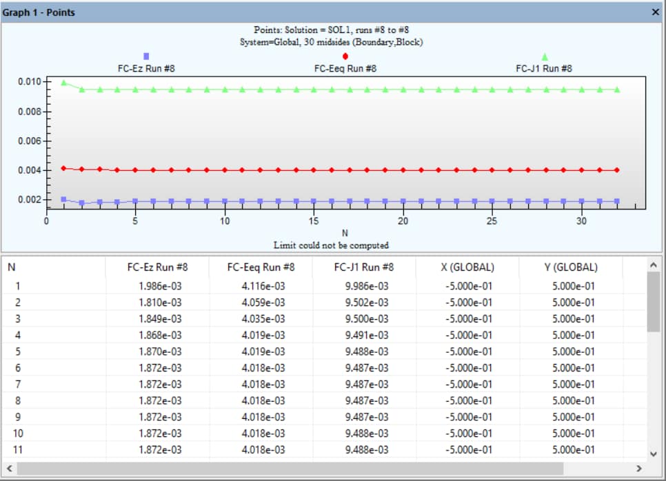 The figure shows the Graph output from the Points extraction interface in which the Failure Criteria functions Ez (ϵz), Eq (ϵeq) and J1 (J1) were requested at several points. Note that each function has the prefix FC- before the name in the legend of the graph and in the column heading of the table. The solution ID and run # included in the titles are the ones selected in the Points interface.