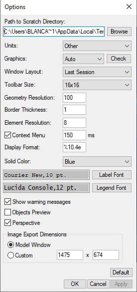 Use File > Options to activate the Options dialog shown in Figure 3. This dialog lets you control a variety of default and startup program settings. You may choose the default Units, default Window Layout, the default display format, the default border thickness of geometric boundaries, the default element edge resolution used to render your model in the Model View, etc.