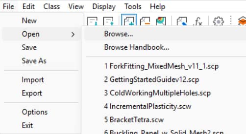 Under Open > will be a listing of recently opened files, as well as options to browse StressCheck files in the most recent path (Browse…) or browse StressCheck Handbook files in the Handbook directories (Browse Handbook…).