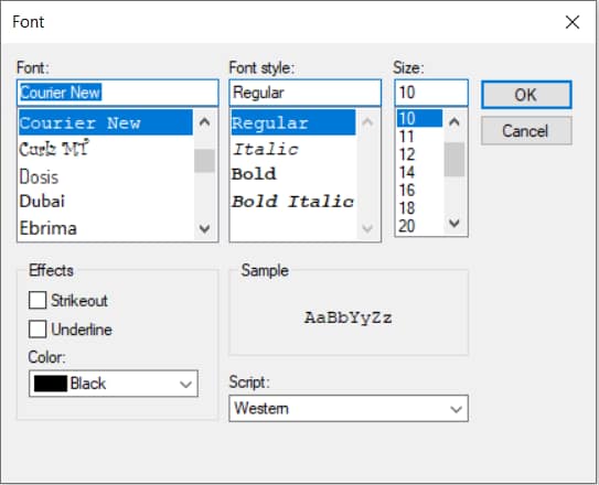 Specify the font name, style and size for the display of object labels, markers and other text displayed in the Model View. Default is Courier New, 10 pt.