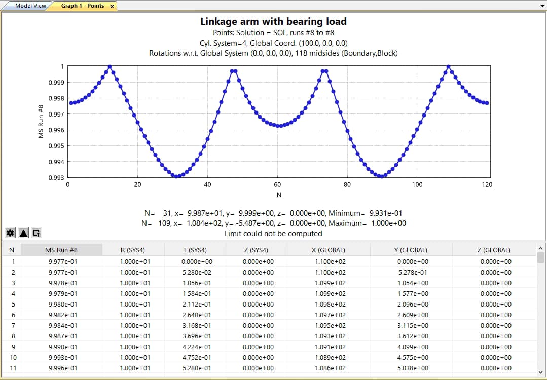 Note that the solution variable name used to indicate the tangential stress is Sy, because a local Cylindrical system was selected. The results of the computation of the formula MS for 120 equally spaced points (not counting the end points) along the circle will be displayed in the Graph pane as shown below. Note: You can extract results from only one formula at a time.