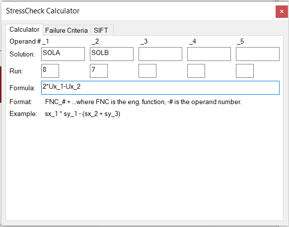 To complete the Calculator dialog, simply supply the names of Solutions ID’s you want to combine, the corresponding run numbers, and the algebraic expression you wish to evaluate. The formula field uses the StressCheck functions with the operand number of the corresponding Solution ID. The entries in Figure 4 indicate that we are interested in the difference between 2 times the X-displacement corresponding to SOLA, Run 8 and the X-displacement corresponding to SOLB, Run 7: