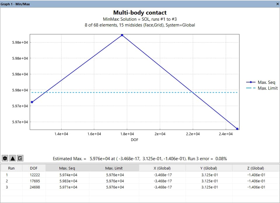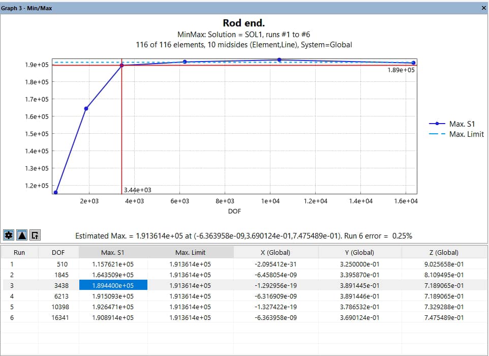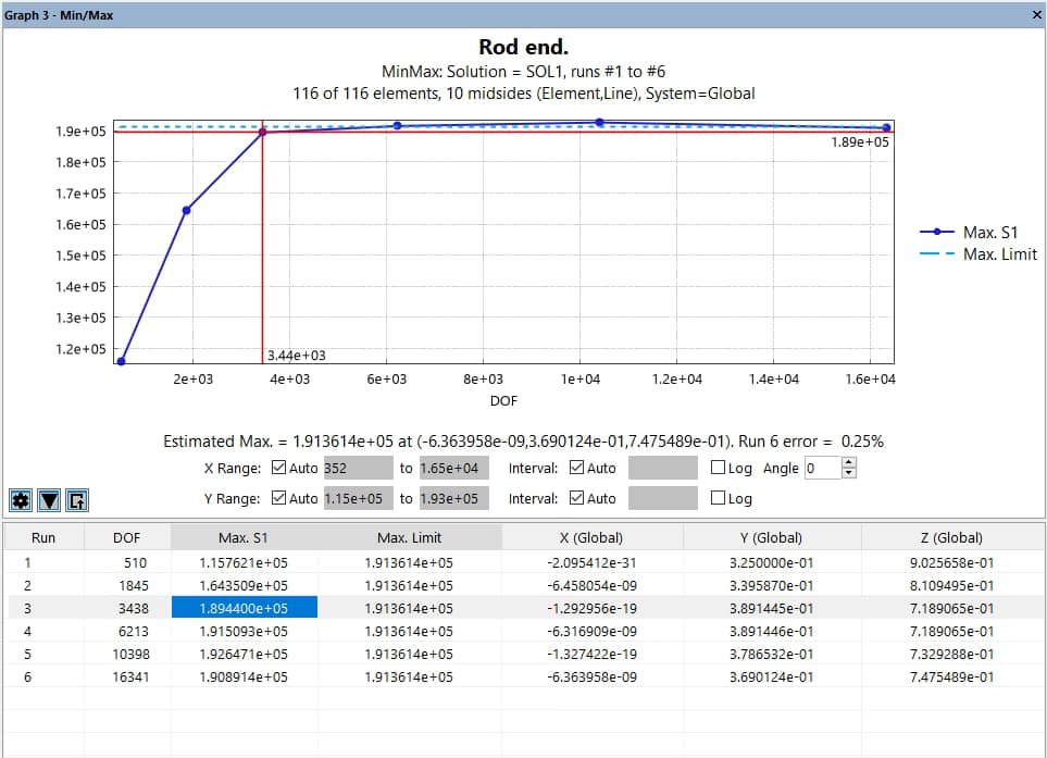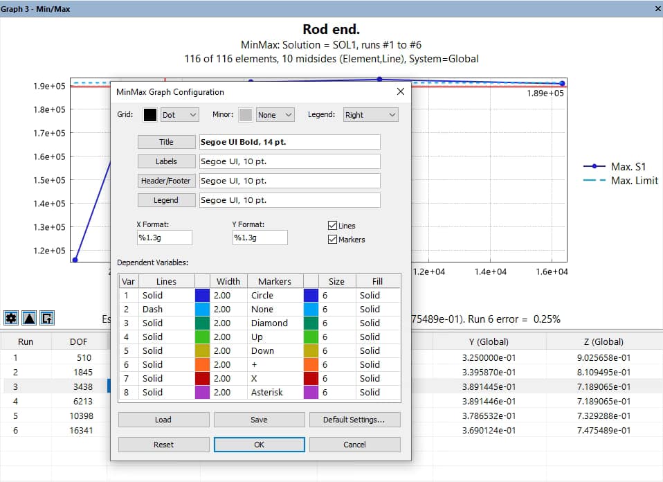 - If the Independent (X-axis) Variable is “N”, “Element #”, or “DOF” then StressCheck disables point rendering and displays the following message: “Number of points exceeds pixel resolution, displaying an average line.”