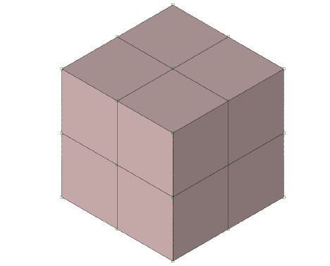 To perform a uniform mesh refinement choose Select > Any Element > Uniform Div. > Name: Test, Layer: 1, Midsides:1 and click on the element you want to refine and then click on the Accept button. This will create the h-discretization record. To activate the h-discretization meshing operation, click on the Mesh button. If instead of Any Element you select All Elements, the refine operation will be performed on all elements of the mesh. Figure 2 illustrates the effect of a uniform refinement operation applied to a straight sided hexahedral element: