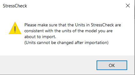 Use the File > Import menu option, then set the file filter to identify which type of file you wish to import. A warning will be issued to make sure the Units setting in StressCheck is consistent with those of the model to be imported: