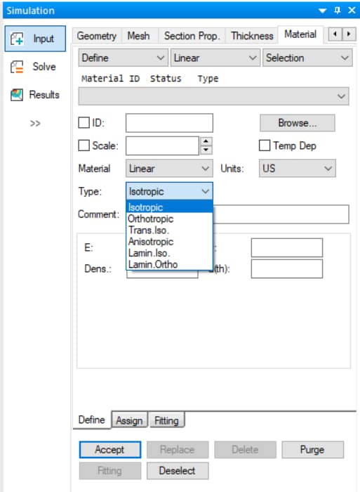 To define linear elastic material properties open the Model Inputs window and set the C/A/O/M to Material > Define > Linear > Selection and select the linear elastic material type from the “Type:” dropdown menu (Figure 1). The available linear elastic material definition types are: