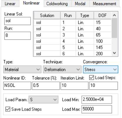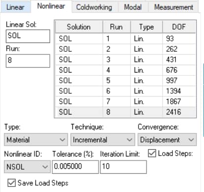 Selecting a different run number of the linear solution to start a nonlinear iteration will result in a new nonlinear solution record with different degrees of freedom and run number than the previous one. Both nonlinear solutions will be available for extraction. You can obtain as many nonlinear solutions as there are linear solutions. In this way you can check the convergence characteristics of the nonlinear solutions.
