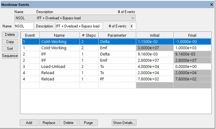 - If a nonlinear events record has not already been defined via the Nonlinear Events dialog, you may define the nonlinear events to be solved by clicking on the Load Steps button and the Nonlinear Events dialog will be displayed. This dialog will be active until dismissed. For more information on defining nonlinear events, refer to the Nonlinear Events Overview.
