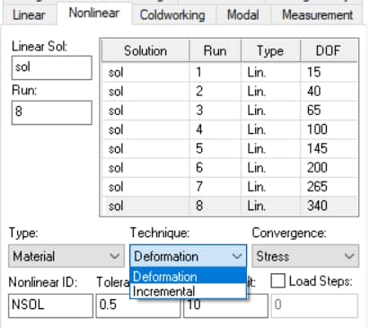 - Select the Technique: Deformation, and specify the Convergence option (Stress or Energy) and Tolerance (%). The Convergence options and Tolerance are discussed in the Nonlinear Analysis Overview.