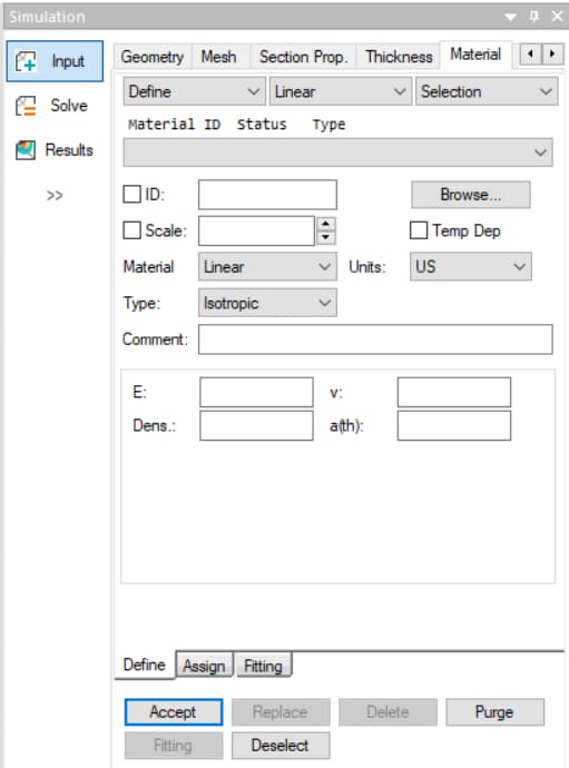 To define material properties, select the Define subtab at the bottom of the Material tab in the Input dialog and specify a material ID in the ID: box.