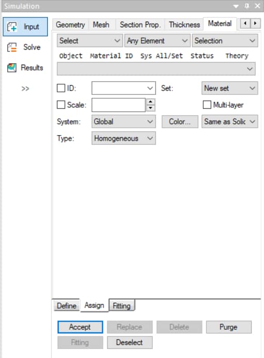 To assign a material ID name to an element or group of elements which are to have the specific properties, select the Assign subtab at the bottom of the Material tab, and the form will change to the assignment form. Then, select the material ID from the ID: dropdown.