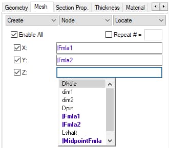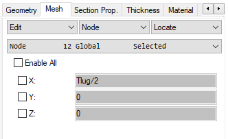 To revise the mesh object/automesh generator data associated with an input field, enable the checkbox next to the input field and modify the input data. Then, you may click the Replace or Move button (see the discussion below on the use of the Replace and Move buttons for an object being edited). For example, if you Edit a node defined at a parametric Global location via Edit > Node, the input fields will populate with that node’s X, Y, Z values (Figure 14):