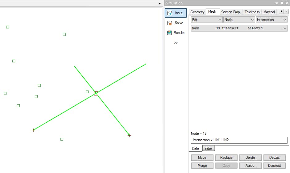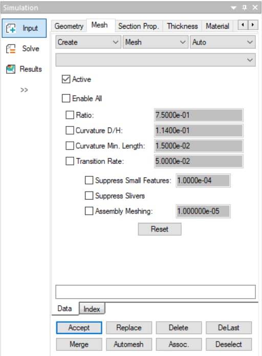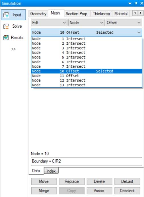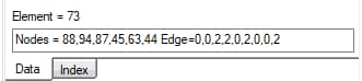 At the bottom of the Mesh tab are two subtabs: Data and Index. The Data subtab allows for specification and modification of meshing input data (e.g. node X,Y,Z coordinates, node offset value, MeshSim automeshing parameters), while the Index subtab provides a scrolling list of existing mesh object/automesh generator records for selection, modification and deletion (Figure 2):