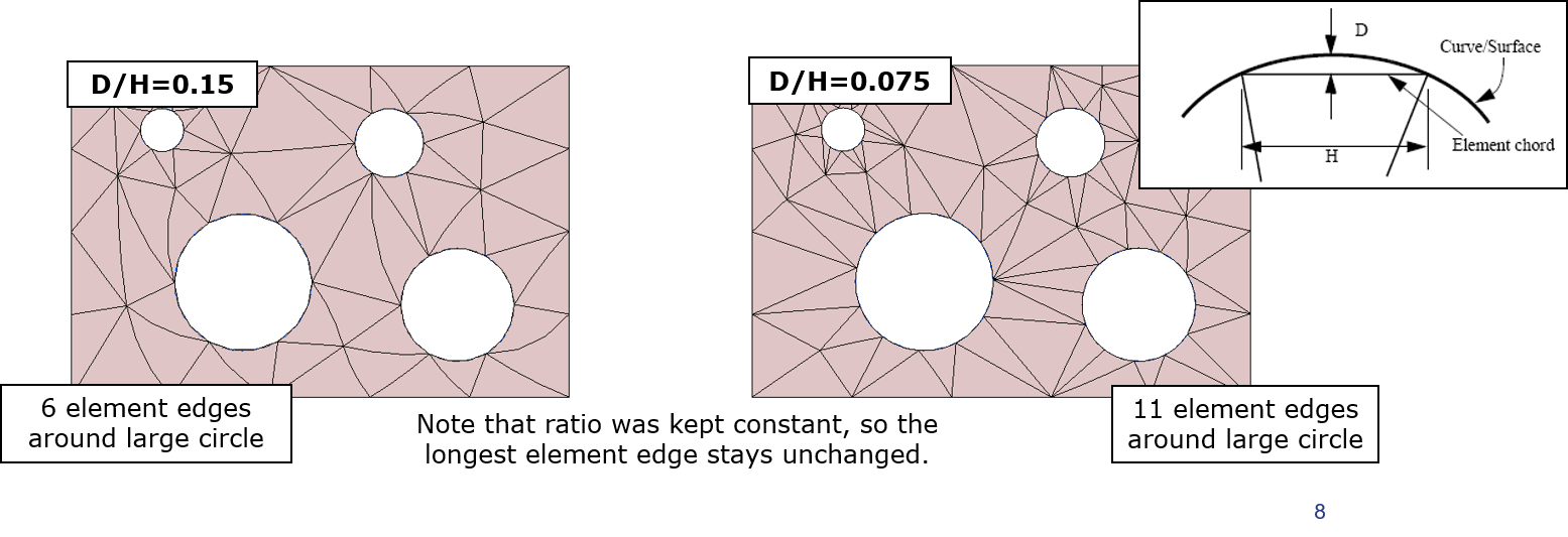 The user may specify the ratio of the distance from the chord formed by an element edge and its associated curve (D) or surface, relative to the length of the element edge (H). Default value is 0.114. Valid range value: 0.005 to 0.4.