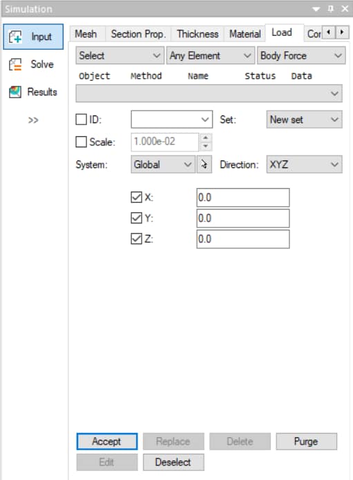 The Model Input, or simply Input, dialog provides access to the various Input classes, including Geometry, Mesh, Section Properties, Thickness, Material, Load, Constraint, and Solution ID (Figure 1). The Input dialog provides a tab for each available input class. These tabs are ordered in a way consistent with a typical model creation sequence: create/modify geometry, attach a mesh, assign attributes, apply loads and constraints, etc.