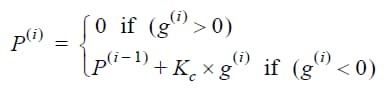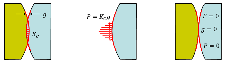 where P is the pressure in the contact zone and g is the corresponding gap. During each iteration of the contact solution procedure, the values of un1 and un2 are recomputed and the value of the gap updated. For the ith iteration, the contact pressure (P) is computed as: