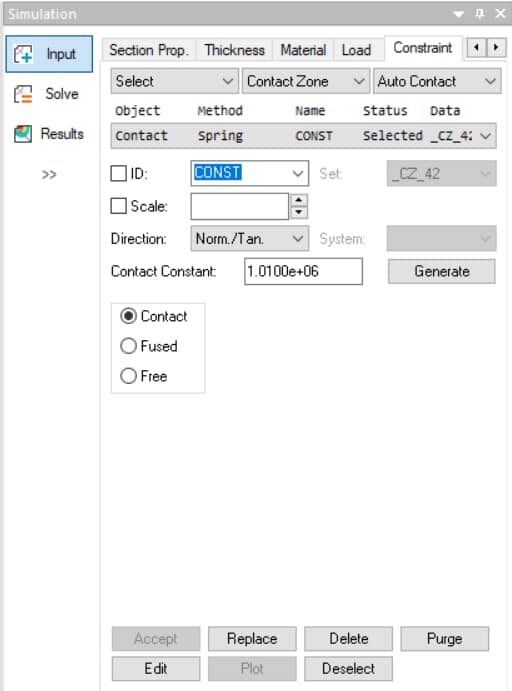 For automatic generation of the contact constant, if no elements are associated with at least one of the selected contact zones, or no material properties have been assigned for at least one of the elements associated with the contact zones, the contact constant is not generated and an error is issued indicating the missing conditions.