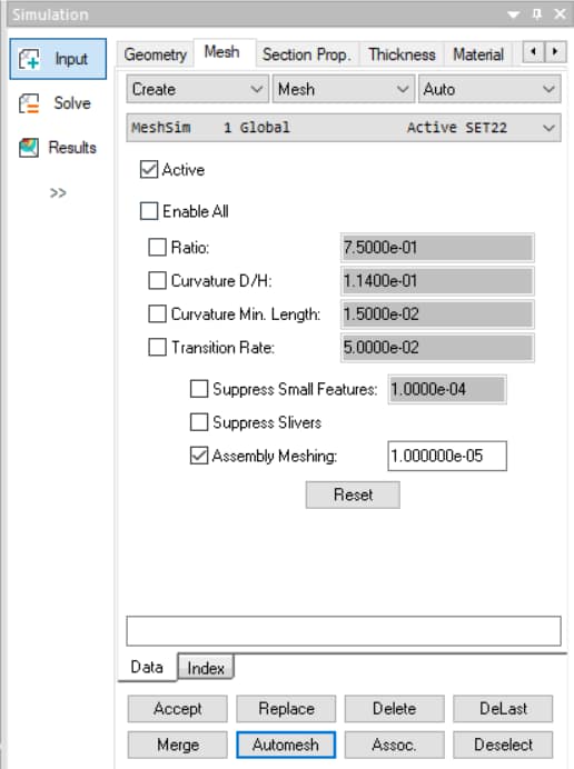 To automatically define a multi-body contact analysis with the bodies having linear or nonlinear material properties, first enable the Assembly Meshing toggle under Mesh tab > Create > Mesh > Auto before automeshing the selected bodies. Once the Assembly Meshing toggle is enabled, then the following sequence will be performed once the Automesh button is clicked: