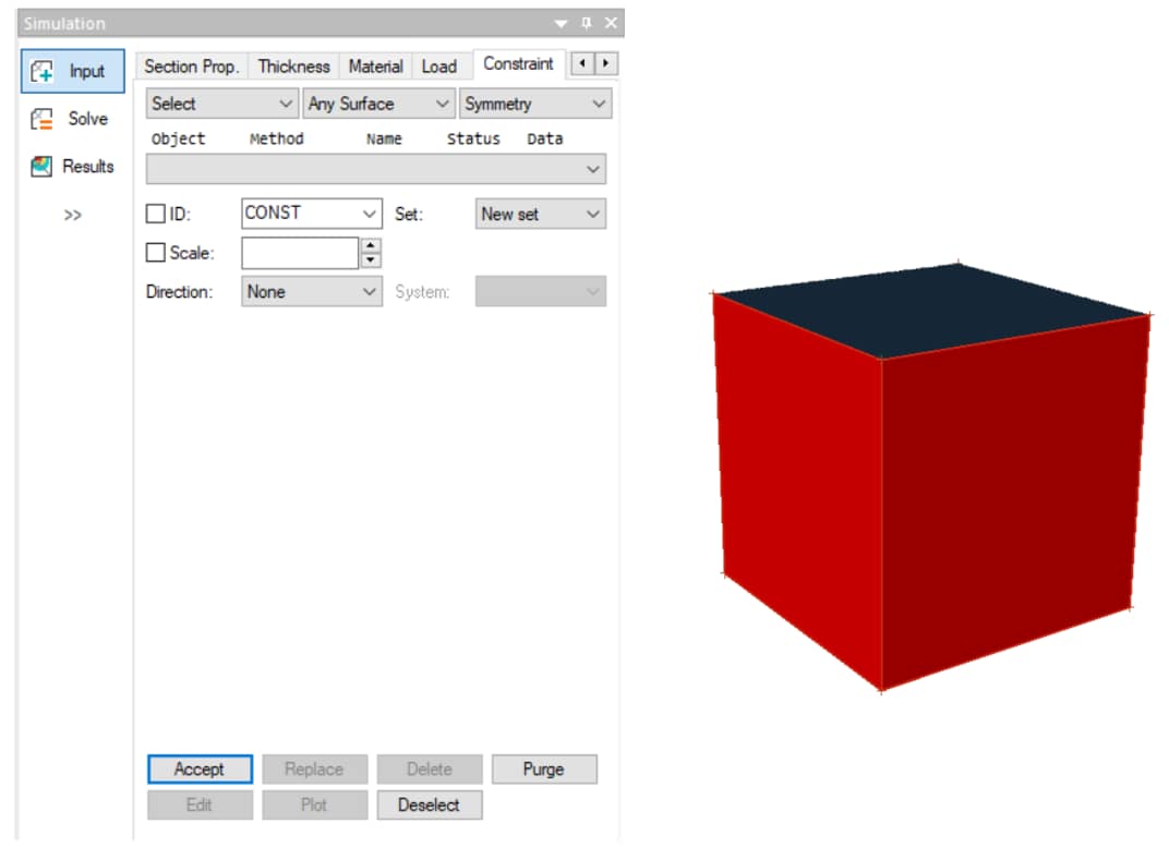 In this case, clicking the Accept button will result in the creation of a Symmetry constraint record on the two selected surfaces (as well as a new surface set named “SET##” where ## is the next available integer).