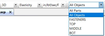 Once parts have been defined, they may be chosen for selective viewing using the combo box in the Part Toolbar that may be activated from the View menu in the Main menu bar. The Part combo-box lists all available parts in the model, and the option All Objects and All Parts. Selecting a Part name from the Part combo-box will result in only that Part definition being displayed in the Model View. Selecting All Parts will result in all user-defined Part definitions being displayed, while selecting All Objects will display all model objects.