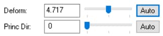 Determine if the plot extraction should be displayed in a scaled deformed configuration (“Deform:”), or if the plot extraction should be displayed with principal direction arrows in the undeformed configuration (“Princ Dir:”). Figure 8 demonstrates the appearance of these options. Note: the “Princ Dir:” plot scale option will only be available if a principal stress or strain function (e.g., S1, E1) is selected.