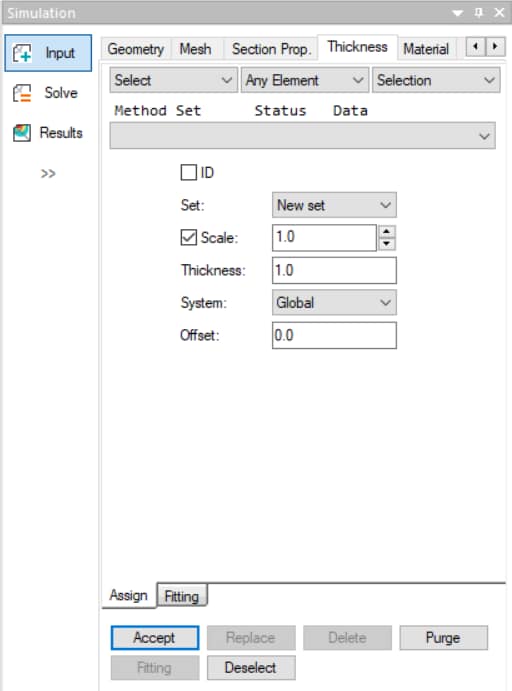 To assign a thickness to an element or group of elements, select the Thickness tab in the Input dialog. You may then specify all elements in the model (All Elements), elements one-by-one or a group of elements (Any Element), one or more surfaces (Any Surface), or a fully enclosed group of surfaces (Mesh Region) for assignment of thickness. Finally, click Accept to add the thickness assignment record.