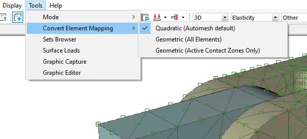 Allows the user to switch between Quadratic and Geometric mapping if the model contains automeshed elements (Figure 2). Note: Successful element mapping conversions will be automatically added to the element set “_CONVERT_PASS”, while failed element mapping conversions will be automatically added to the element set “_CONVERT_FAIL”. Failed element mapping conversions will remain quadratic mapping.