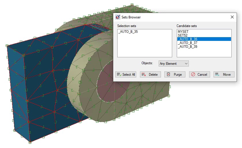 When a set name from either list is selected (e.g., the “MYSET” or “_AUTO_B_35” element set), the members of that set will automatically be highlighted on the screen. A Candidate set may be identified as a Selection set by double clicking the set name (or selecting the set name and clicking the Move button) from the list at the right, at which time it will be added to the selection list at the left. For example, to select all elements in the automatically generated mesh set “_AUTO_B_35” simply change the Objects combo-box in the Sets Browser to “Any Element”, then double-click on “_AUTO_B_35” in the Candidate sets list (Figure 3). All elements in the element set “_AUTO_B_35” will be selected.