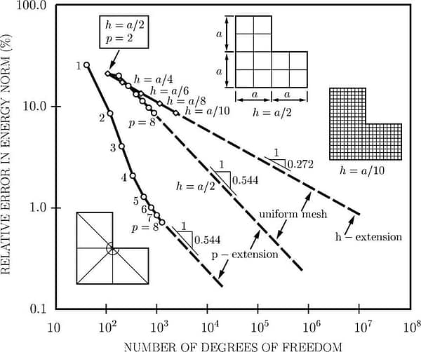 Assume that we wish to reduce the relative error in energy norm to 1 percent. If we increase the polynomial degree uniformly (p-extension), on a geometrically graded mesh then we have to solve less than 103 simultaneous equations. In contrast, if we use a uniform mesh refinement and p = 2 (h-extension) then we have to solve about 107 equations. The ratio is roughly 104. It took less than one second on a desktop computer to solve 103 equations. If we assume that the solution time is proportional to the number of degrees of freedom squared, then achieving 1% relative error with uniform mesh refinement would take 108 seconds or 3.2 years. This shows that the errors of approximation can be controlled only through proper design of the discretization scheme, which involves taking the characteristics of the underlying mathematical problem into consideration.